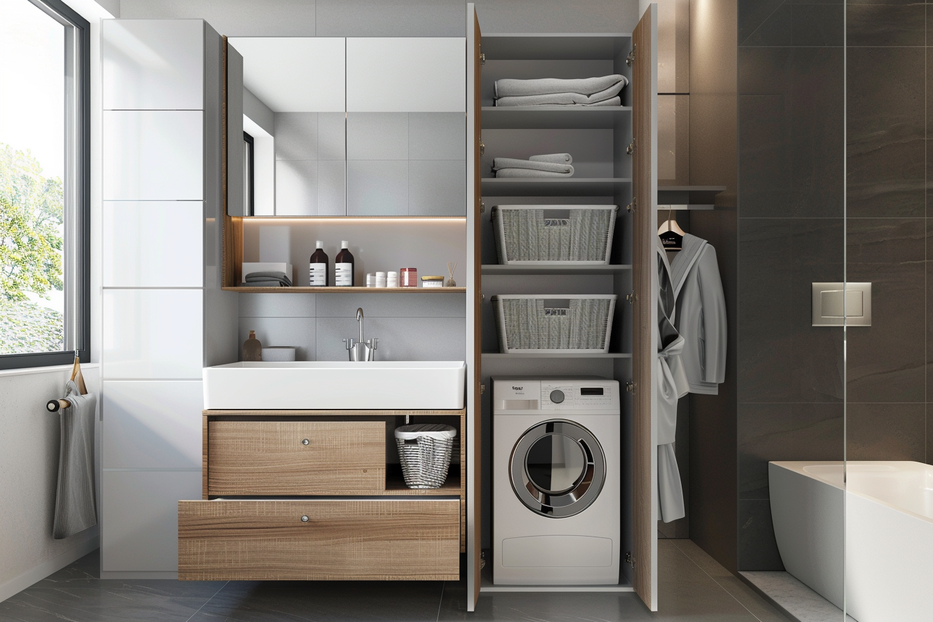 By integrating laundry into the bathroom, space is maximized, and daily routines become more efficient. Built-in storage keeps detergents and essentials neatly organized.