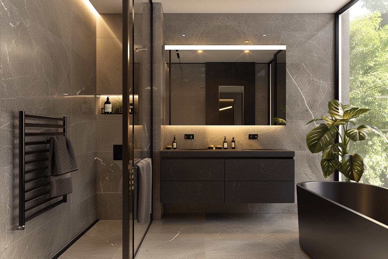 Modern bathroom lighting systems use LED fixtures with energy efficiency and long lifespans. Accessories are crafted from stainless steel or anodized aluminum for durability.