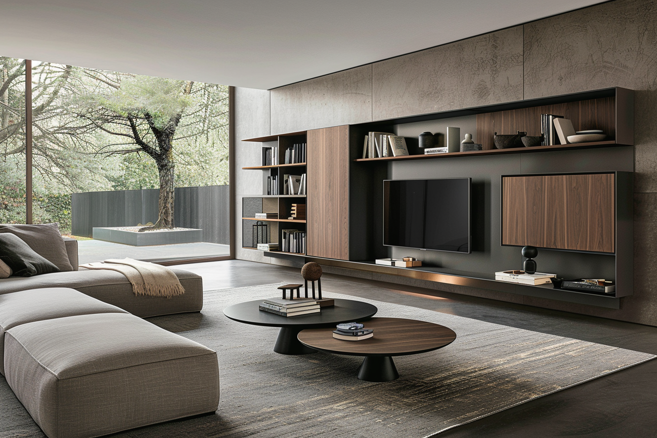 Defined by clean lines and minimalist design, modular systems can combine open shelves, cabinets, and paneling. Finishes range from wood veneer to lacquer, offering endless customization.