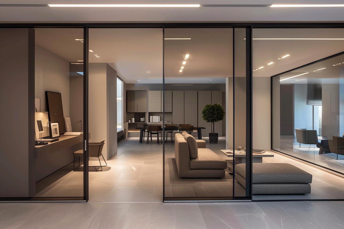 Sliding wall systems that redefine interiors with flexibility, seamlessly dividing or uniting spaces in a minimalist design.