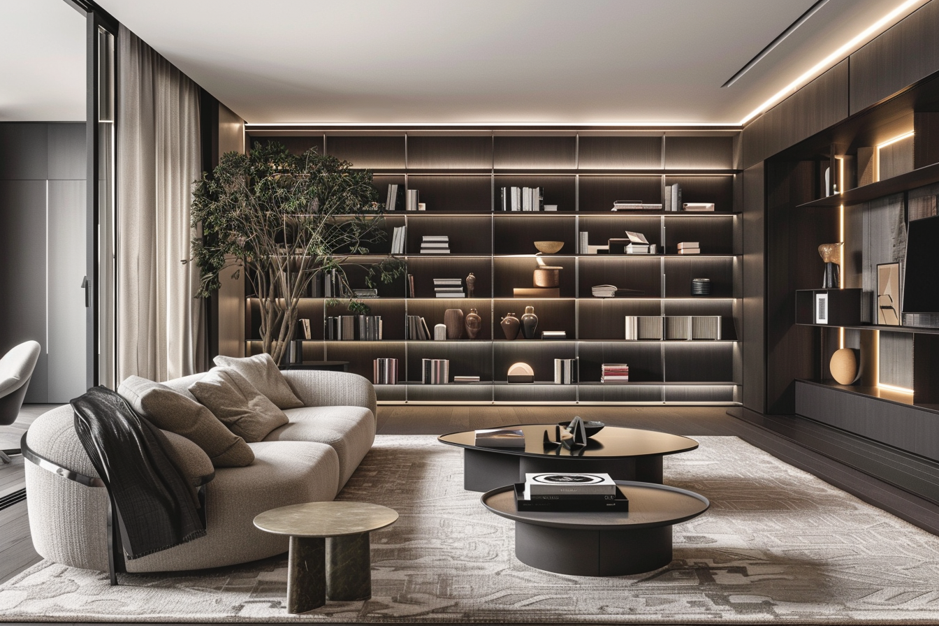 Materials, finishes, and lines extend across doors, walls, and furniture, achieving true harmony.